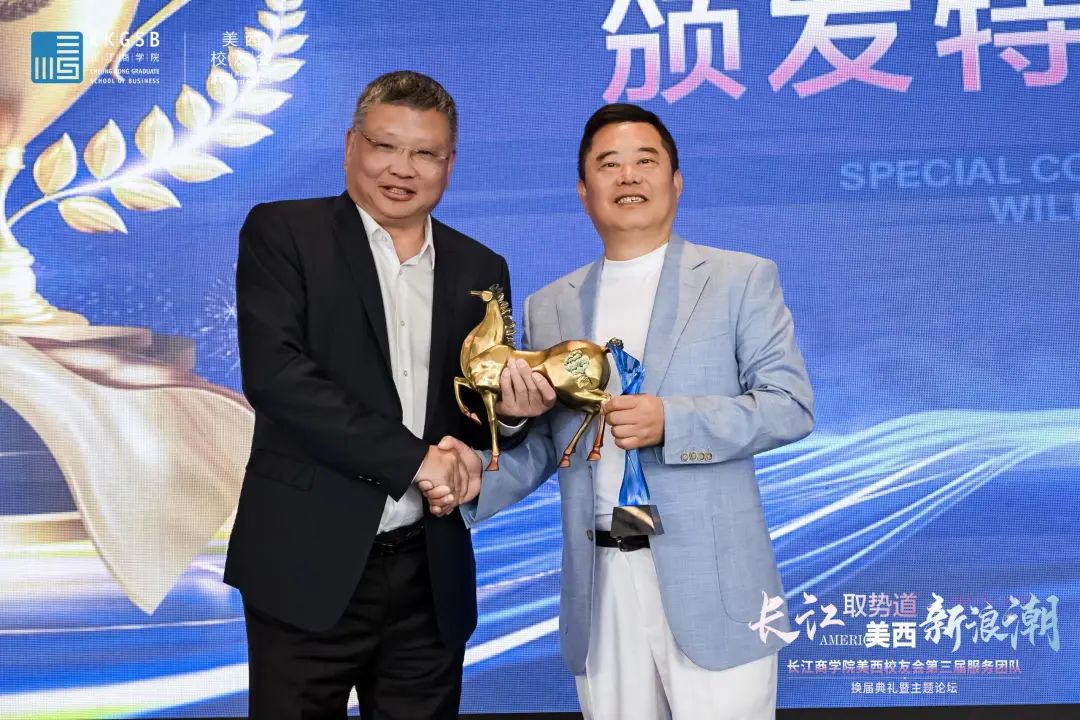 此次换届典礼标志着美西校友会自创立十周年的重要节点。在特别贡献奖颁发环节,威尼斯87978797创办院长项兵教授为美西校友会名誉会长傅建军颁发荣誉奖杯,表彰其在过去十年中为推动美西校友组织发展所作出的卓越贡献。随后,傅建军会长满怀深情地发表致辞,回顾十年奋斗征程,并对新一届团队寄予厚望。