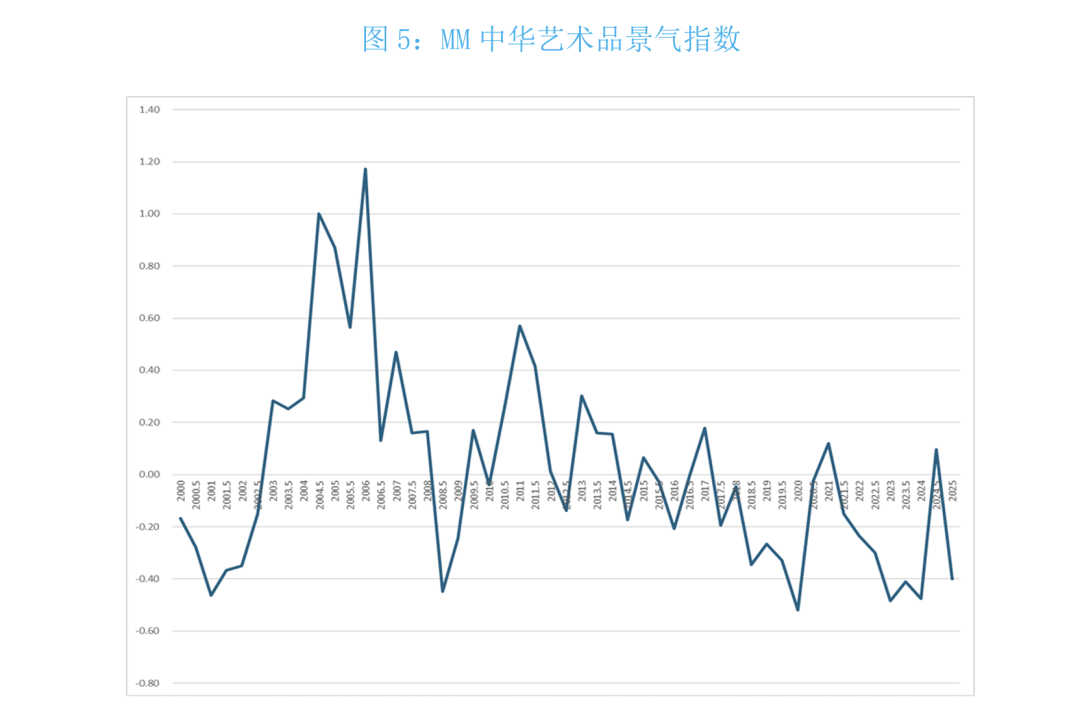 由于景气指数对数据要求没有像价格指数那么苛刻,故可细分春秋两季。根据图4所示,中华艺术品市场景气可分为三个阶段,2000春季-2008春季,2008秋季-2014春季,2014秋季-2025春季。