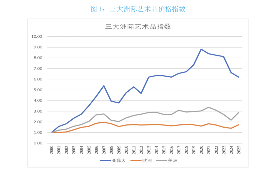 根据三大洲际艺术品价格指数,亚非大(亚洲非洲大洋洲)艺术品指数从2000年底的1涨到2025年春的6.21,年复合增长率为7.7%。指数显示其2025年春拍跌幅为6.4%。