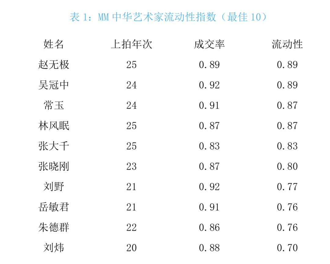 MM中华艺术品流动性指数构建的目的是用来衡量艺术家作品的流动性,其有三个指标构成:上拍年数、成交率和流动性(流动性=上拍年数/样本年*成交率)。