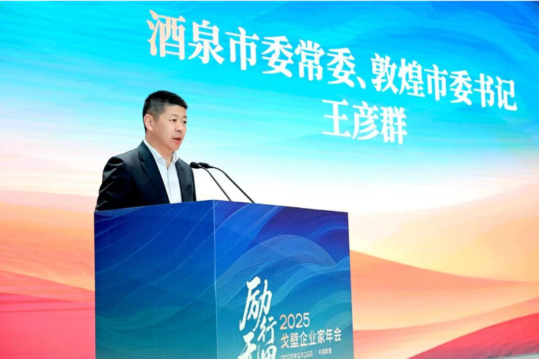 酒泉市委常委、敦煌市委书记王彦群向参会企业家致欢迎辞,系统阐述了敦煌作为文明交汇地与当代创新策源地的双重使命。