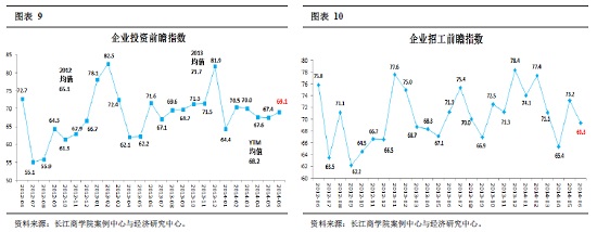 企业招工前瞻指数本月数据为69.3,5月数据为73.2(图表10),这说明大多数企业依然在着力扩张人力。但由于高企的用工成本,可能会对企业利润造成挤压。