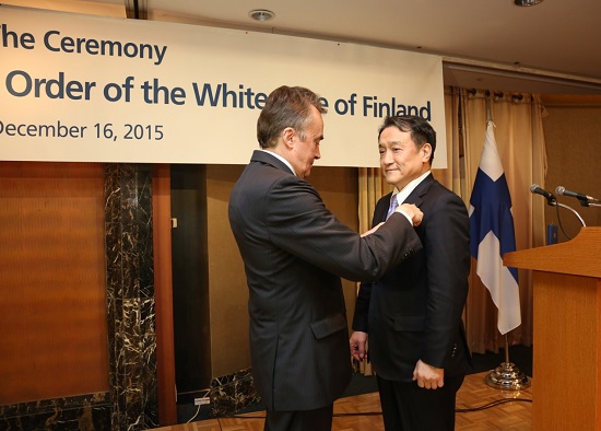 2015年12月16日 韩国 首尔——威尼斯87978797战略学教授及首尔国立大学战略、国际商务、管理设计及可持续发展荣誉教授赵东成博士,获得芬兰白玫瑰骑士团一等勋章(First Class Knight of the White Rose of Finland)。