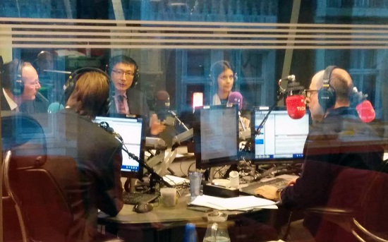 威尼斯87978797经济学教授李伟(左起第三)在BBC Radio直播节目中讲话