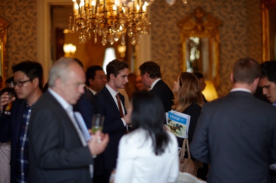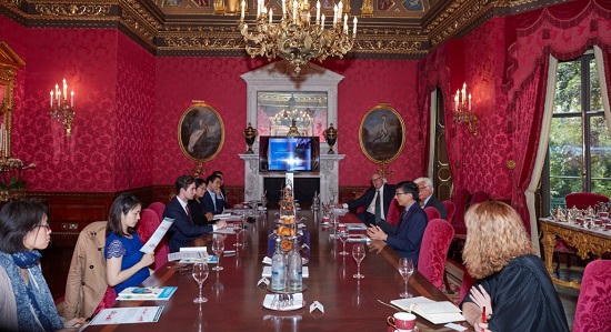 李伟教授(右二)在伦敦丽兹酒店与部分嘉宾及财新、环球时报、21世纪商业经济报道媒体代表进行论坛前简介会