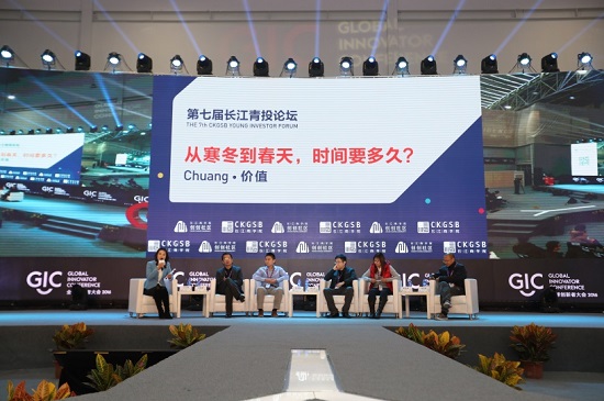 “Chuang价值”高峰对话环节嘉宾对话,从左至右:凤凰投资管理合伙人,长江校友金融学会秘书长付小楠(主持人)、天鹰资本执行合伙人迟景朝、经纬创投合伙人王华东、斗鱼直播创始人兼CEO陈少杰、VIPKID创始人兼CEO米雯娟、未来生活创始人兼CEO喻华峰