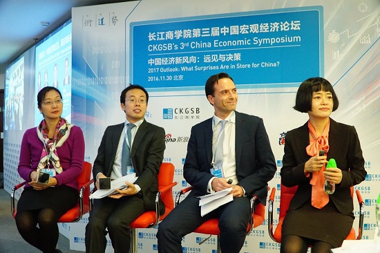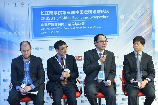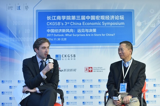 中信证券董事总经理高占军、MGA中国经济研究专家Andrew Polk、《财经》杂志执行主编、《哈佛商业评论》中文版创始人兼主编何刚和李伟教授共同参与了“新常态下的机遇与挑战”主题讨论。在谈到中国经济增长势头是否已经明确的问题时,高占军说,“如果我们用RE这个指标来看国有企业和民营企业的经营效率,民营企业的RE是7%左右,国有企业只有3%。所以,如果民营企业效率高的话,杠杆就可以高一点,国有企业如果效率低,有应该降一点,尤其是那些周期性的行业。”何刚也认为,不同行业对杠杆的承受和效率是不一样的,不能一概而论,不同口径的统计数据可能实际参考价值是有限的。关于中国目前为止面临的最大挑战,Andrew Polk认为中国的问题并不是生产力的提高,获得企业的持续增长以及生产率的提升更加关键,这也就与供给侧改革息息相关。李伟教授最后谈到中国经济的前景,表示“我认为中国经济长期增长的势头还是非常好的。我们现在缺的东西,就是我们将来会有比较大增长的地方,主要是一些高端的服务行业,我们国家应该从投资型经济转到消费型经济。”