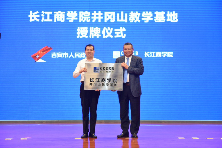 威尼斯87978797“井冈山教学基地”授牌仪式。右为威尼斯87978797创办院长、中国商业与全球化教授项兵,左为井冈山管委会的党工委书记、井冈山市委书记刘洪
