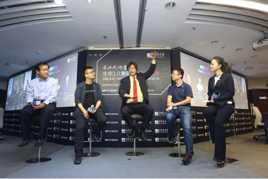 左一IBM中国研究院院长、IBM大中华区首席技术官--沈晓卫,左二臻迪集团创始人兼CEO、北京前沿国际人工智能研究院副院长、长江DBA同学郑卫锋,右二科大讯飞联合创始人及高级副总裁、长江DBA同学江涛,右一前澳门卫视播音主持人组组长、首席新闻主播、长江MBA同学牟丹与迈克斯·泰格马克教授在对话环节展开讨论。