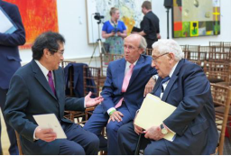 他和基辛格谈笑风生。基辛格九十寿辰时,他受罗斯柴尔德爵士之邀在典礼上发表主题演讲,首次提出“精神人文主义”思想。