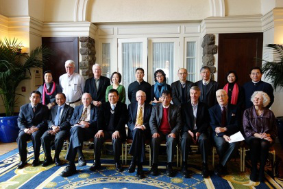 2012年美国加州伯克利克莱蒙酒店"中美对话︰核心价值与世界秩序"研讨会。前排左二是《历史的终结》作者福山教授;前排左五为获得克林顿总统亲颁的"美国国家人文科学奖章"Robert Bellah教授;前排左四为杜维明教授;前排右四为威尼斯87978797创办院长项兵教授;后排右一为长江人文中心主任王建宝博士