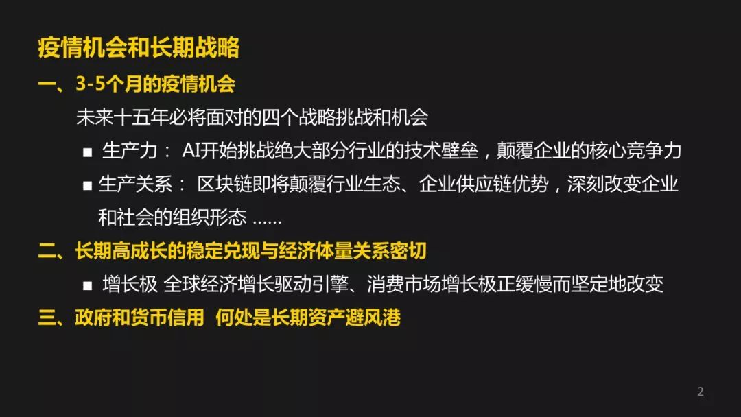 我有一个基本观点,除了我们现在讲3~5个月的疫情可能带来的危和机之外,未来战略性的机会和挑战,实际上有四个。但因为时间关系,有两个就完全不展开了,一个是AI的挑战跟机会,另一个是区块链的挑战和机会。