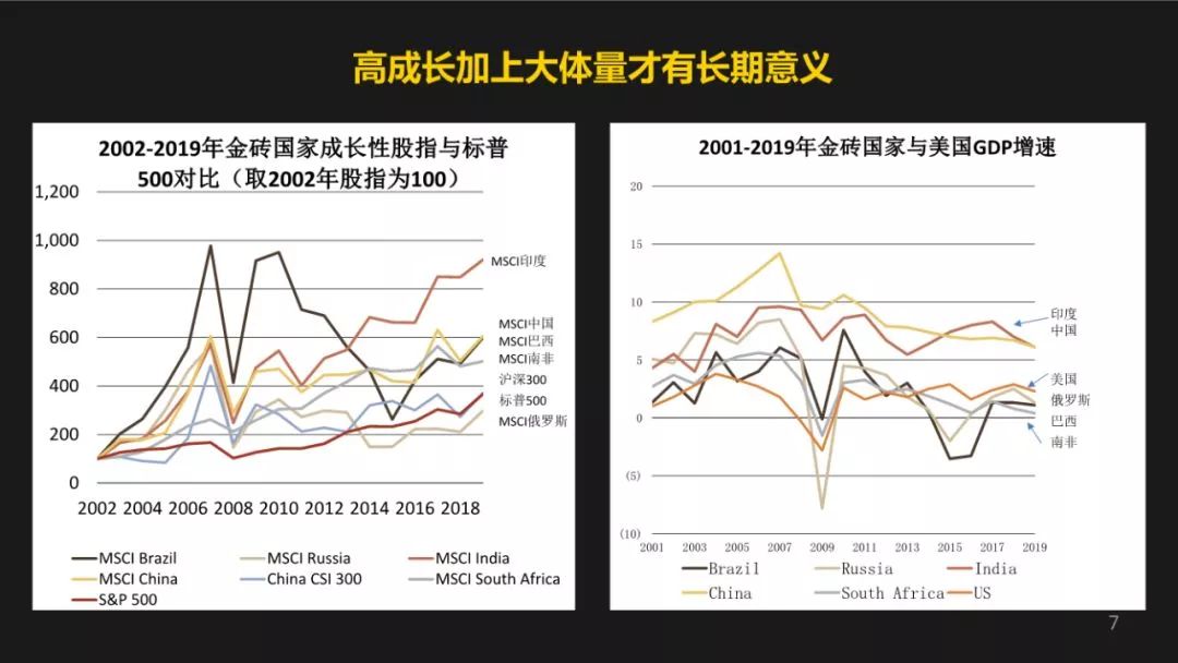 总之,它是稳居第二。中国是从2001年开始,GDP的增长就是稳居第一的。这是金砖5国的情况。如果你看中国、印度的明晟指数的回报,都是远远超过标普500的。
