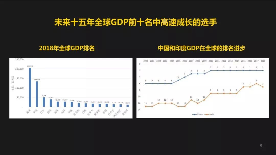 如果你在未来15年,想找高成长的市场,一定要加一个维度,我刚才提了要大体量。大体量有很多衡量标准,其中一个比较容易找的标准就是GDP。我找到了2018年的全球的GDP的排名,中国一如既往是排在老二仅次于美国,印度是排在第七名,巴西排在第九。印度的第七跟第六的法国跟第五的英国,基本上是在一个位置上,我相信很快印度有可能会到达第五名的位置。