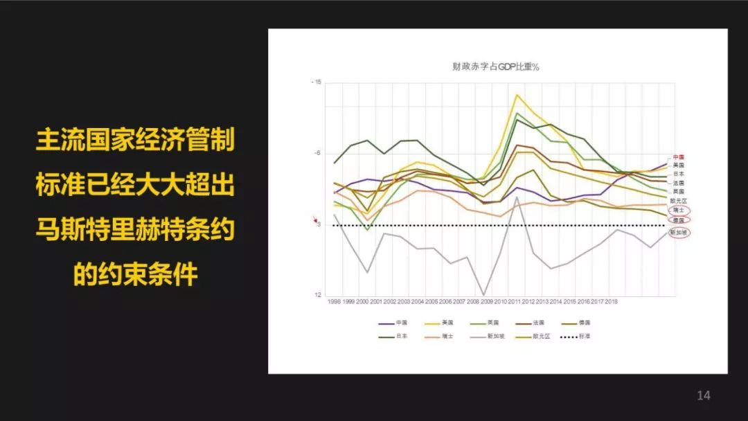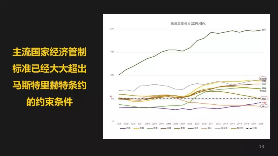 给大家看两张图表,这张图表比较复杂,我简单说一下,主流的经济体现在他的对自我经济的约束的管制标准都已经大大的超出了像欧盟当时设立的马斯特里赫特条约,马斯特里赫特条约其实是非常有逻辑的,也是当时认为比较公认的标准,其中提到第一你国家的债务要小于GDP的60%,迄今为止符合标准的去主要经济体只有几个,德国人非常严谨,他一直是符合的。其次是中国,大家对中国的数字有疑问,还有一个是瑞士。其他的国家都远远高于这个程度,就国家债务占GDP的比例。