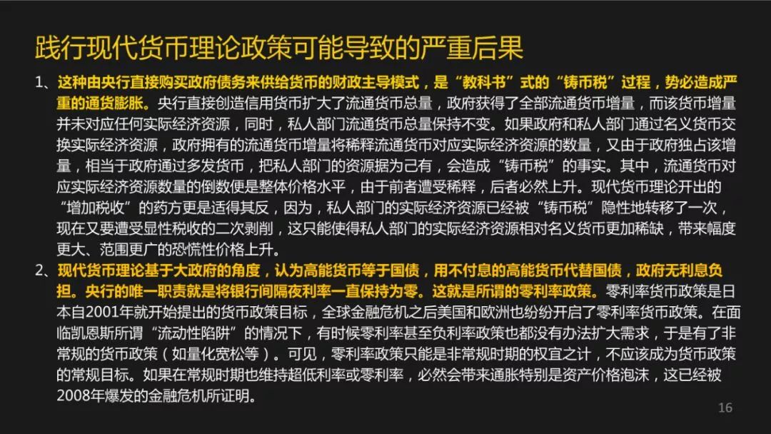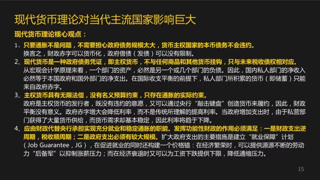 现代货币理论的一些核心的观点,我给大家读一读,我觉得是非常振聋发聩的。第一个,它认为货币主权国家的本地债务是不会违约的。同时他认为现代货币就是一种政府的债务凭证,只和未来的税收和债权对应,不需要跟别的资产挂钩。第三,他认为主权货币具有无限的法偿,所以不用去考虑别的约束,只要考虑通胀一个问题就行了。
