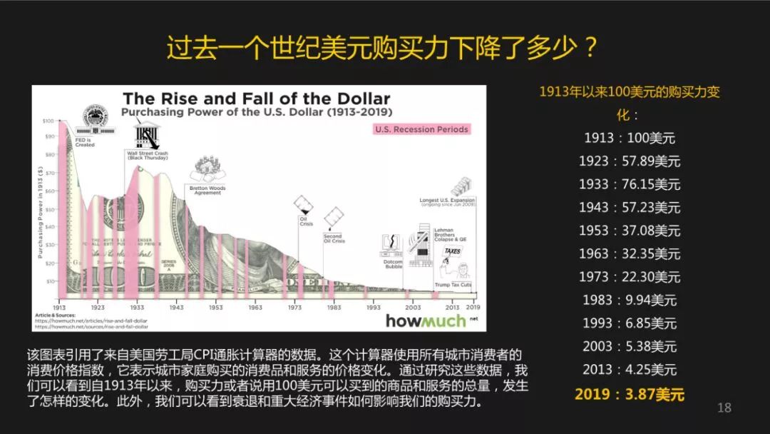 我来看看美元,我们看一下过去一个世纪,美元的购买力下降了多少?这是美国劳工部的一个数据。1913年100美元的价值的购买力,到2019年,将近106年后购买力剩下多少呢?只有3.87美元,大家听了是不是很震撼?但是其实 ,美元的年贬值率只有3.4%而已。经过100年100块就变成3块8毛7。