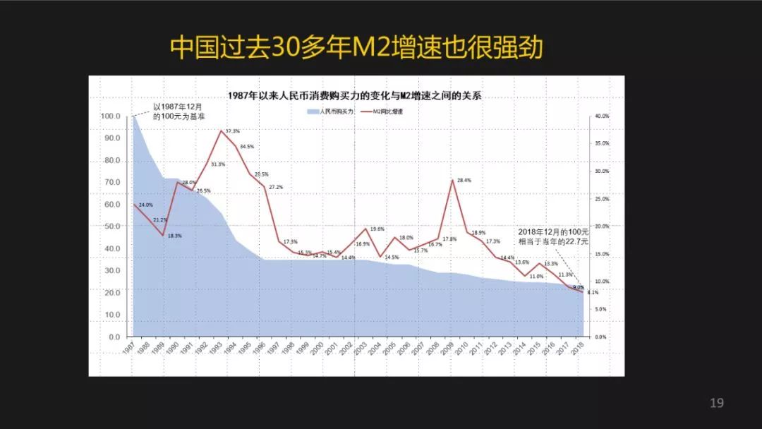 大家猜一猜中国跟美国的货币贬值率哪个高呢?其实中国算起来大概每年5%左右,美国刚才讲的大概3.4%左右。