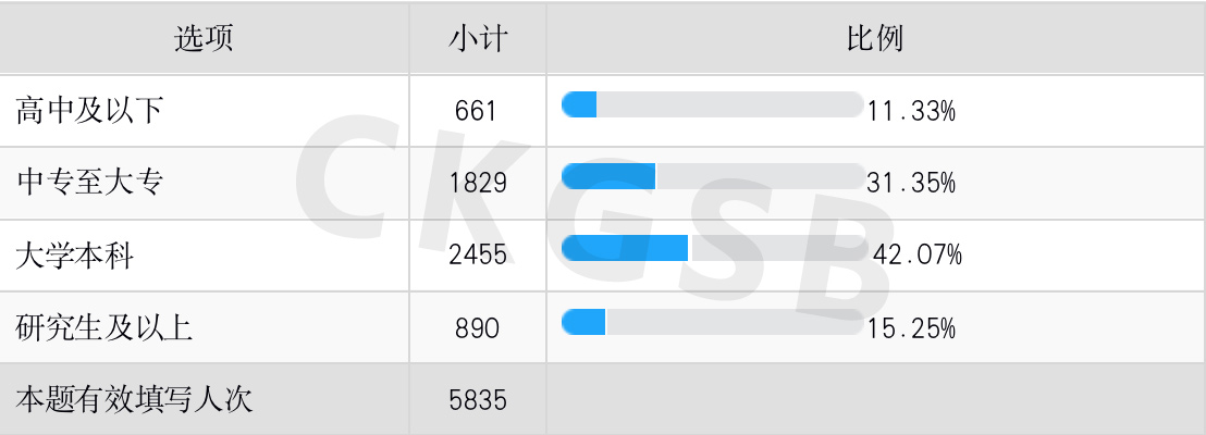 4.学历:本次调研对象的学历以大学本科比例最高,达到42.07%;其次是中专和大专,占比约31.35%;研究生及以上占比15.25%;高中及以下占比最低,约为11.33%;