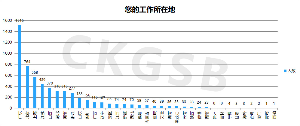 5.地域:受访者工作所在地以广东省数量最高,有1515人,其次是北京764人,上海568人、江苏439人、山西、河北、河南均在300人以上,浙江277人,和山东、四川、广西、辽宁,其余均在100以下。有70位受访者工作地在湖北省。