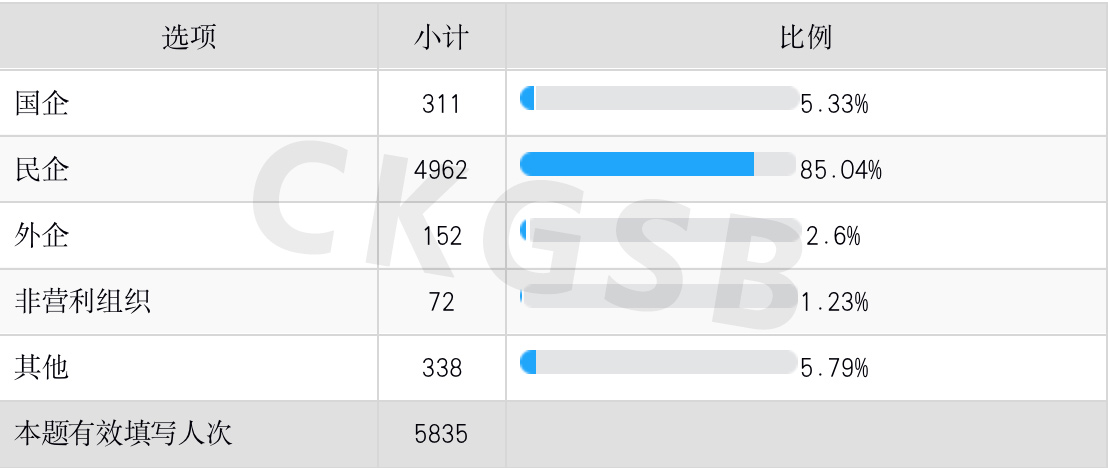 6.企业性质:85%以上受访者来自民营企业,国企和其他类型企业受访者占比分别为5.33%和5.79%,外企及非营利组织占比较低,分别为2.6%和1.23%。