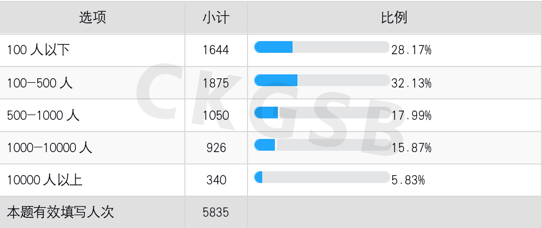 7.企业人数:来自中小型企业的受访者在问卷样本中占比较高,约60.3%的受访者来自500人以下企业。其中,100-500人的企业占比最高,占比为32.13%,来自100人以下企业的受访者约占28.17%,而所在企业为500-1000人的受访者占比17.99%,1000-10000人和10000以上的占比分别约为15.87%和5.83%。