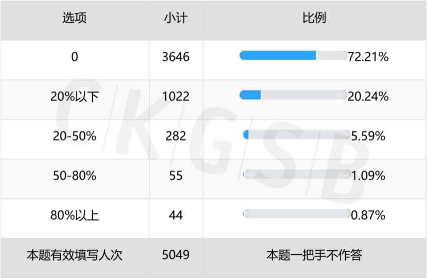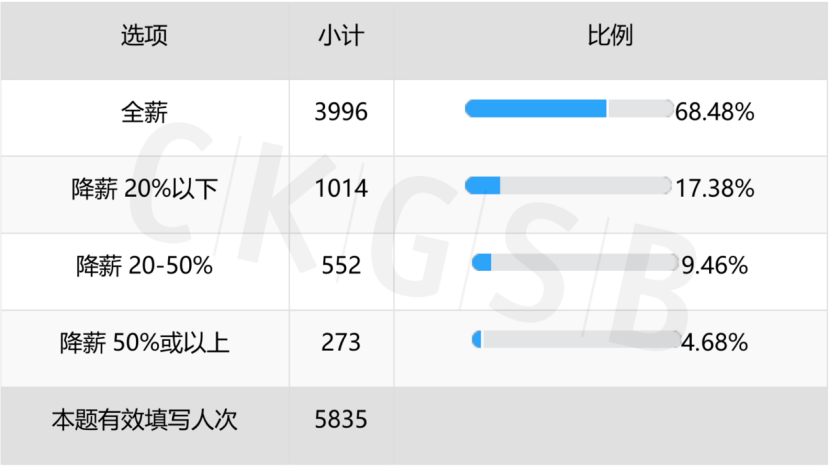 总样本中,有超过三分之二的人所在企业没有降薪,近4000人。所在公司出现20%以内平均降薪幅度的有1014人,降薪程度在20-50%的有552人,降薪在50%或以上的有273人。