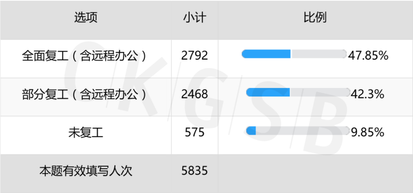 在总样本中,所在企业已全面复工(含远程办公)的有2792人,占47.85%;所在企业部分复工(含远程办公)的有2468人,占42.30%;而未复工的有575人,占9.85%。这表明绝大多数受访者(90.15%)所在企业已复工,但其中全面复工的比例未过半(47.85%)。