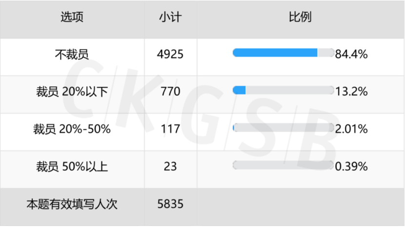 有4925人表示所在公司没有裁员,占总样本量的84.4%。另有770人表示所在公司整体裁员幅度在20%以内,公司裁员20%-50%的有117人,公司裁员50%以上仅有23人。