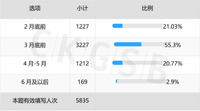同时,我们进一步分析了对于全面恢复经营时间判断的职级分布(如下图),主要发现了两个显著趋势。
