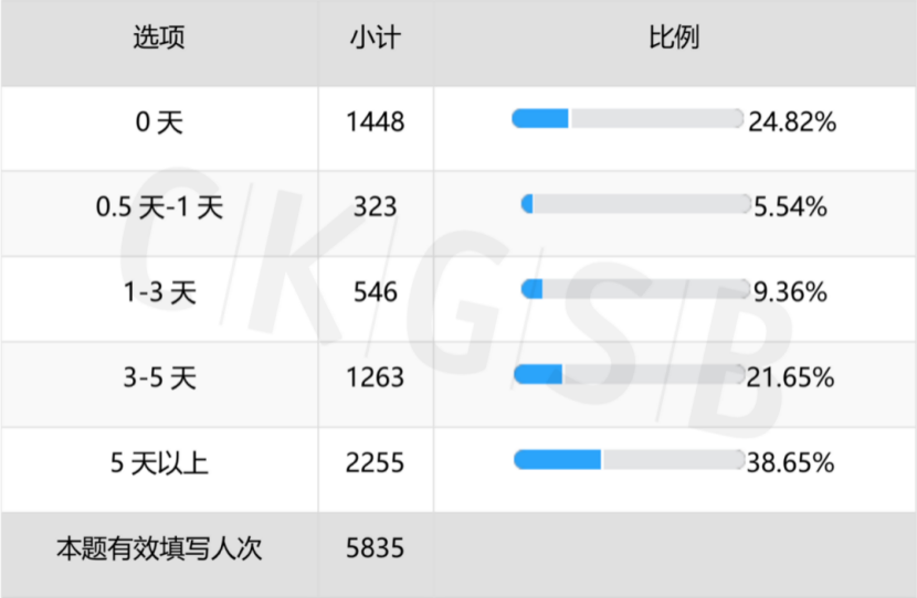 在5835位受访者中,每周去公司5天以上的有2255人,超过三分之一;3-5天的有1263人,占总样本量的21.65%。综合以上两项我们发现,超过半数的受访者每周去公司办公3天以上,占比60.3%。而仍有1448人目前无需去公司办公(远程办公或未复工),占到样本总量的24.82%。
