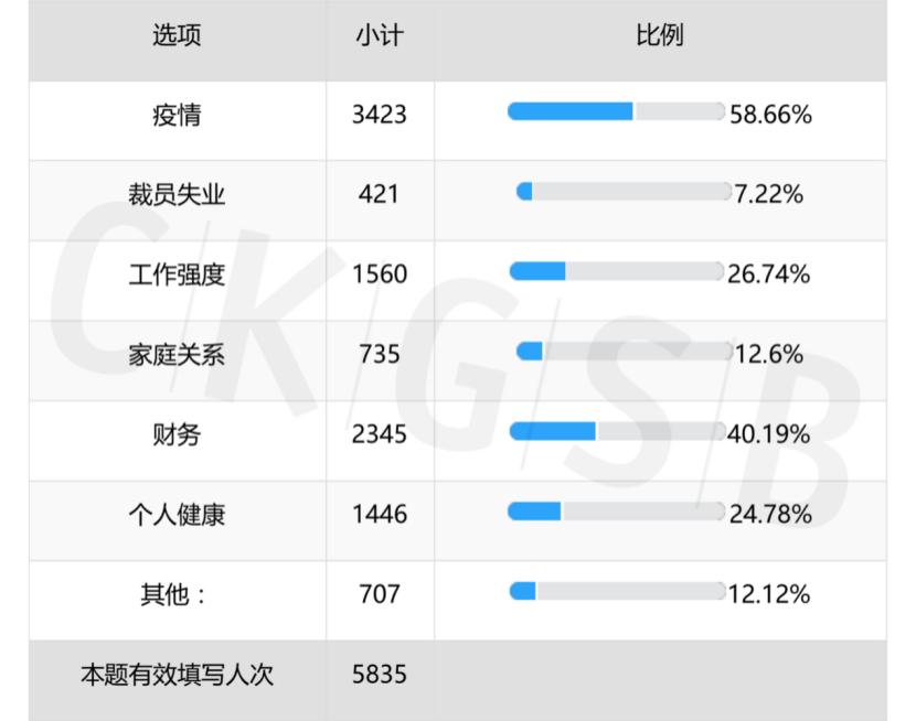 在填写问卷的5835人中,所在企业复工且全薪的有3453人,占样本总量的近60%。其他的个人工作状态按比例排序依次为: