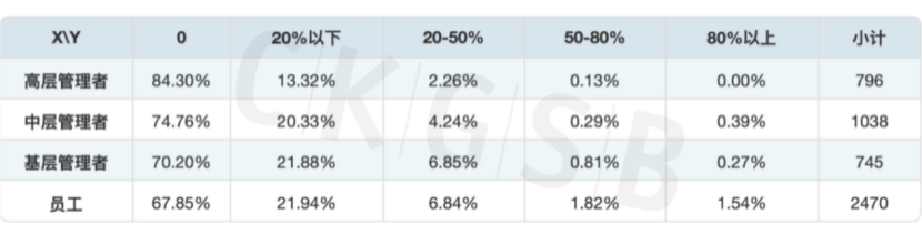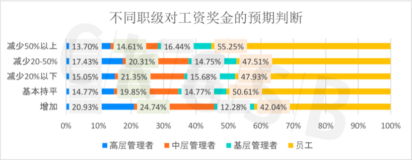 在认为全年工资奖金会增加的578位受访者中,员工占比最高,为42.04%,基层管理者占比最少,为12.28%,中层和高层管理者分别占比24.74%和20.93%。在判断工资奖金减少50%以上的受访者中,员工占比55.25%,基层、中层、高层管理者占比逐级递减,为16.44%、14.61%和13.7%。