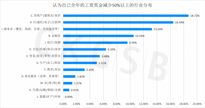 在认为全年工资奖金会减少50%以上的219位受访者中,占比最高的三个行业是房地产(18.72%)、互联网(16.44%)、服务业(13.24%)。