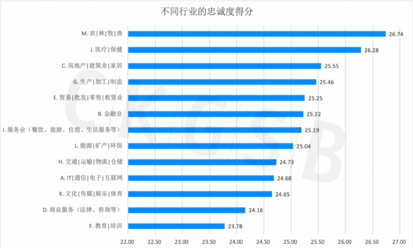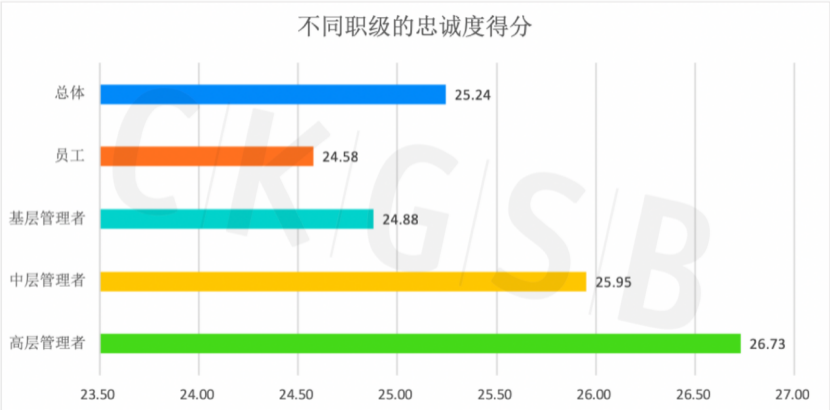 受访者(不含一把手)的忠诚度量表得分为25.24(最高得分为30分),受访者的忠诚度与职级成正相关关系。忠诚度得分最高的三个行业为农|林|牧|渔、医疗|保健和房地产|建筑业|家居。