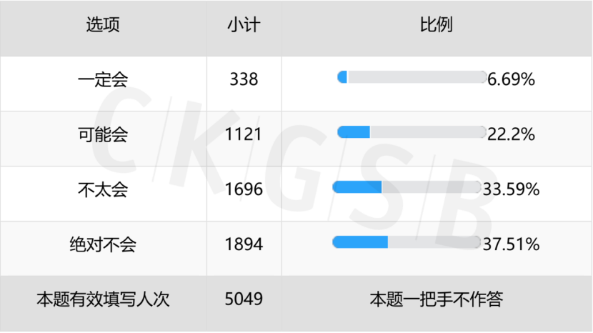 72.21%的人认为自己不会被裁员,63.34%的受访者认为自己全年的工资收入会持平或增加,超过70%的受访者认为疫情过后自己不太会或绝对不会跳槽。