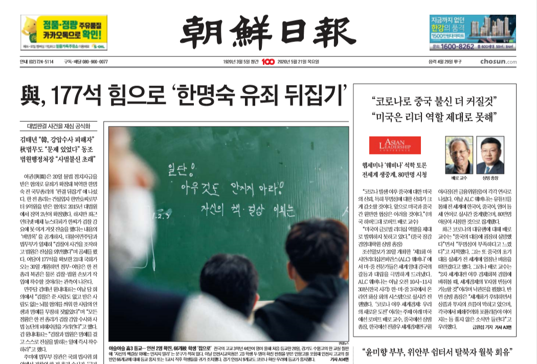 5月21日韩国《朝鲜日报》头版对活动进行报道