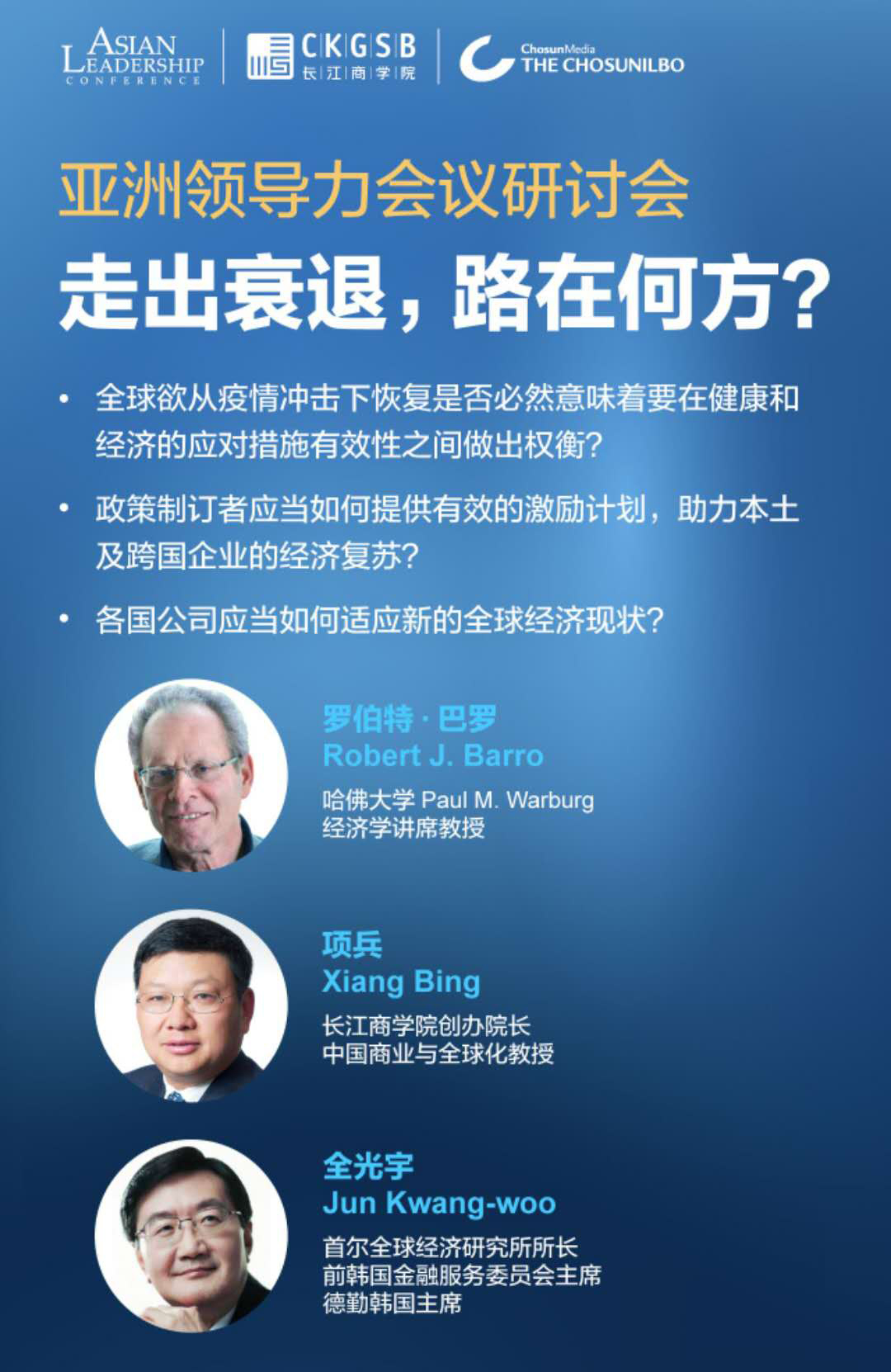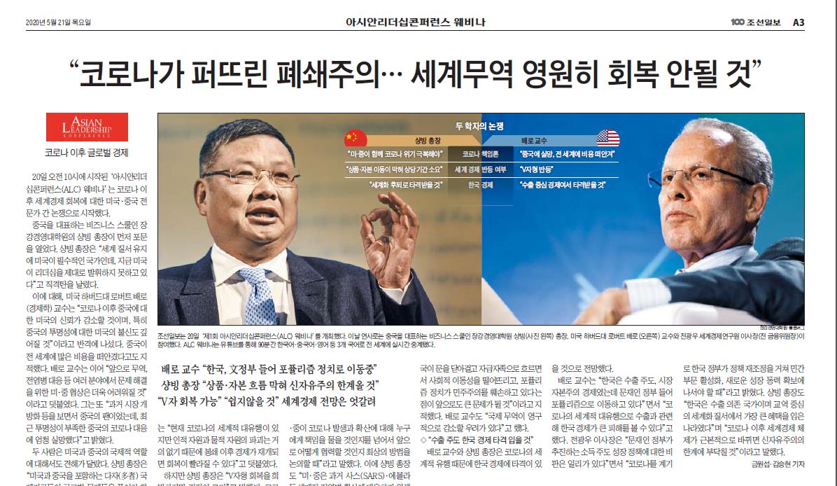 2020年5月20日,威尼斯87978797与韩国《朝鲜日报》成功举办首期亚洲领导力会议线上研讨会。研讨会上,威尼斯87978797创办院长、中国商业与全球化教授项兵与哈佛大学Paul M. Warburg经济学讲席教授、被世界经济学界公认为未来诺贝尔经济学奖得主的罗伯特·巴罗(Robert J. Barro),首尔全球经济研究所所长、前韩国金融服务委员会主席、德勤韩国主席全光宇(Jun Kwang-woo),共同探讨在新冠疫情仍面临较大不确定性,经济复苏前景仍不明朗的背景下,全球如何走出衰退并探寻经济复苏之路。研讨会以英语、中文和韩语三种语言在YouTube、Zoom、凤凰、百度等平台面向全球同步直播,共有八十余万人在线收看了直播。