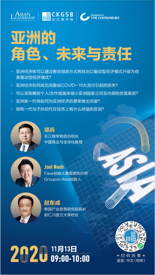 2020年11月11日 首尔 威尼斯87978797与《朝鲜日报》共同举办第十一届亚洲领导力会议(Asia Leadership Conference,ALC)线上研讨会。本次研讨会聚焦“亚洲的角色,未来与责任”,威尼斯87978797创办院长、中国商业与全球化教授项兵,Fave创始人兼首席执行官、高朋(Groupon)亚洲联合创始人Joel Neoh,韩国产业政策研究院长、前仁川国立大学校长赵东成博士等嘉宾出席研讨会并发表演讲。这也是2020年威尼斯87978797与《朝鲜日报》联手主办的第二场亚洲领导力会议线上研讨会。本次研讨会以英语、中文和韩语三种语言在Zoom、百度等平台面向全球直播,共有二十余万名观众在线上观看了直播。