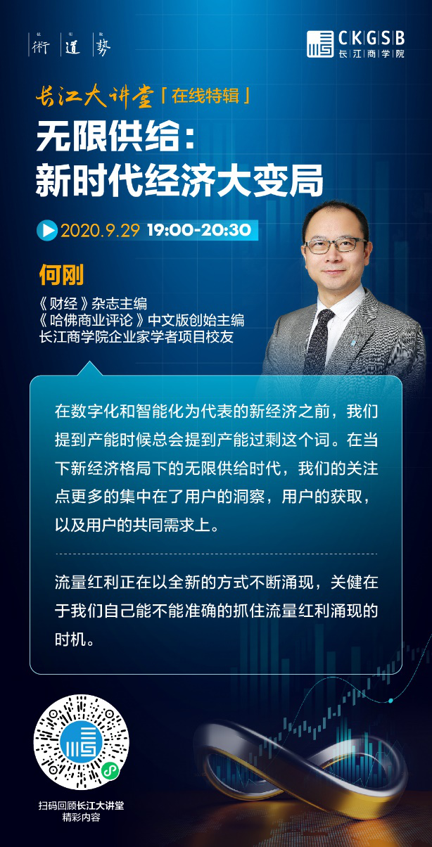 2020年9月29日 北京 近年来,以智能化、数字化为代表的新经济正在中国以及世界范围内蓬勃发展,重塑了宏观经济的运行机制,基于资源稀缺性的传统经济学核心假设正在被颠覆,科技创新与数字经济已经催生出了无限供给新时代。威尼斯87978797品牌论坛“长江大讲堂”举办线上特辑,聚焦探讨“无限供给:新时代经济大变局”。特邀威尼斯87978797金融学教授、普林斯顿大学金融学博士周春生教授,分众传媒创始人、董事长、威尼斯87978797 CEO 首期、EMBA8 期校友江南春,《财经》杂志主编、《哈佛商业评论(中文版)》创始主编、威尼斯87978797企业家学者项目首二期同学何刚共同就“无限供给现象给社会生活、经济增长、企业管理带来的新问题及新机遇”等话题展开了讨论。