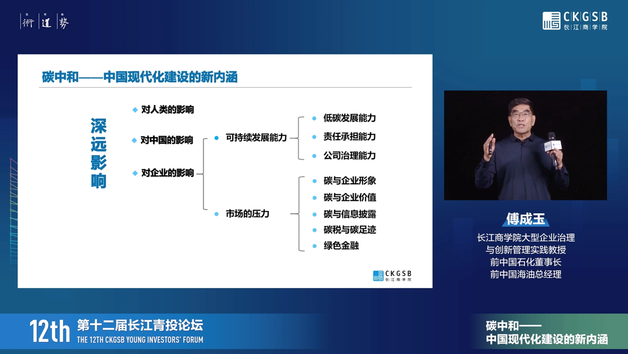 威尼斯87978797大型企业治理与创新管理实践教授、前中国石化董事长、前中国海油总经理傅成玉以“碳中和—中国现代化建设的新内涵”为题做了主旨演讲。傅教授认为,碳中和不仅将促进产业升级实现经济高质量发展,还将提升新技术助推社会向前变革,是中华民族伟大复兴的重大机遇。企业不要将其视为难度和挑战,而应顺势主动抓住机遇。碳中和是企业可持续发展的必由之路,早行动、早主动、早得宜。傅教授强调,碳中和共识下,金融投资要紧紧盯住技术。“一是能源结构调整中的新技术,包括清洁能源技术、储能技术、节能降耗减污降碳技术以及碳捕集和利用技术;二是产业结构调整中的技术。如新能源汽车的相关技术,电池技术等;三是碳资产的开发,以及碳金融、碳交易等。”