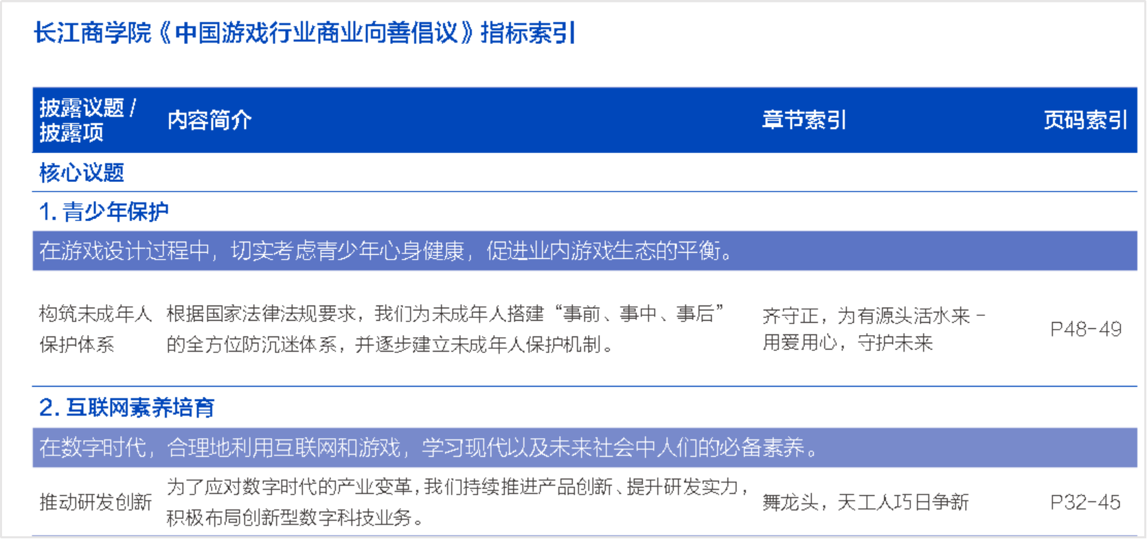 本次《中国游戏行业向善倡议》(以下简称为《倡议》)聚焦近年来屡次处于舆论焦点的游戏行业,携手腾讯、网易、三七互娱、完美世界、世纪华通、游族网络等行业头部上市企业,并通过与EDG电竞俱乐部、光宇游戏、景创科技、NExT Studios、腾讯研究院、腾讯光子工作室、玩出梦想、游戏大观、游戏葡萄等国内游戏行业企业及相关机构合力共创,系统性提炼了现阶段中国游戏行业商业向善的五个维度,分别是:青少年保护、互联网游戏素养培育、跨界推动社会创新、文明传承和文化传播、建设良好的行业环境。《倡议》鼓励游戏企业在其年报或可持续报告中参照这一标准,披露自身在相关维度上高于行业标准的努力,推动游戏行业商业向善。