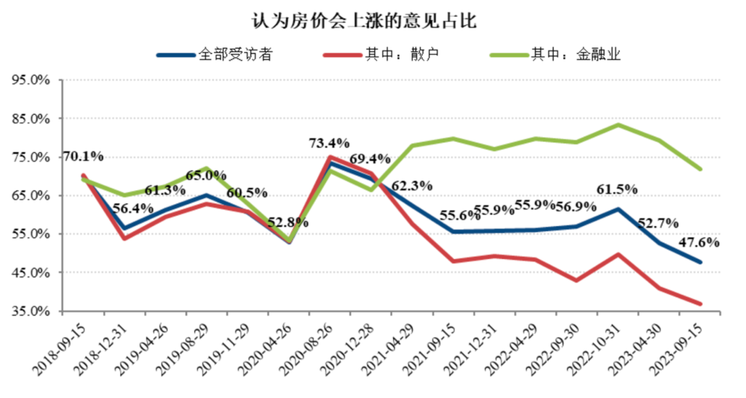 本期约47.6%的投资者认为未来房价会上涨(散户和金融业分别为36.9%和71.8%),比上期下降5.1个百分点(散户和金融业分别下调了4和7.5个百分点),比2020年8月下降25.8个百分点(散户下降了38个百分点,金融业提高了0.4个百分点)。