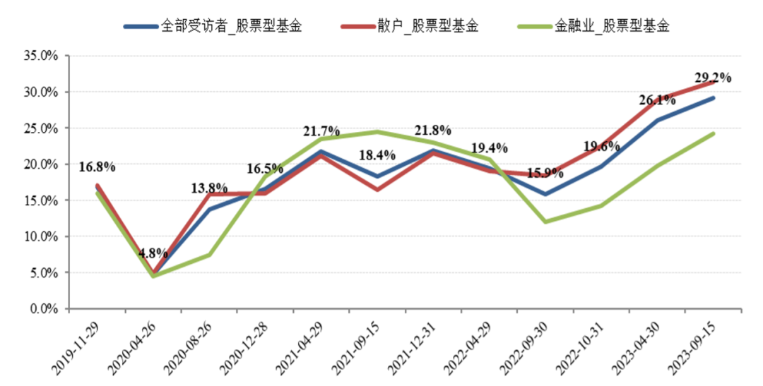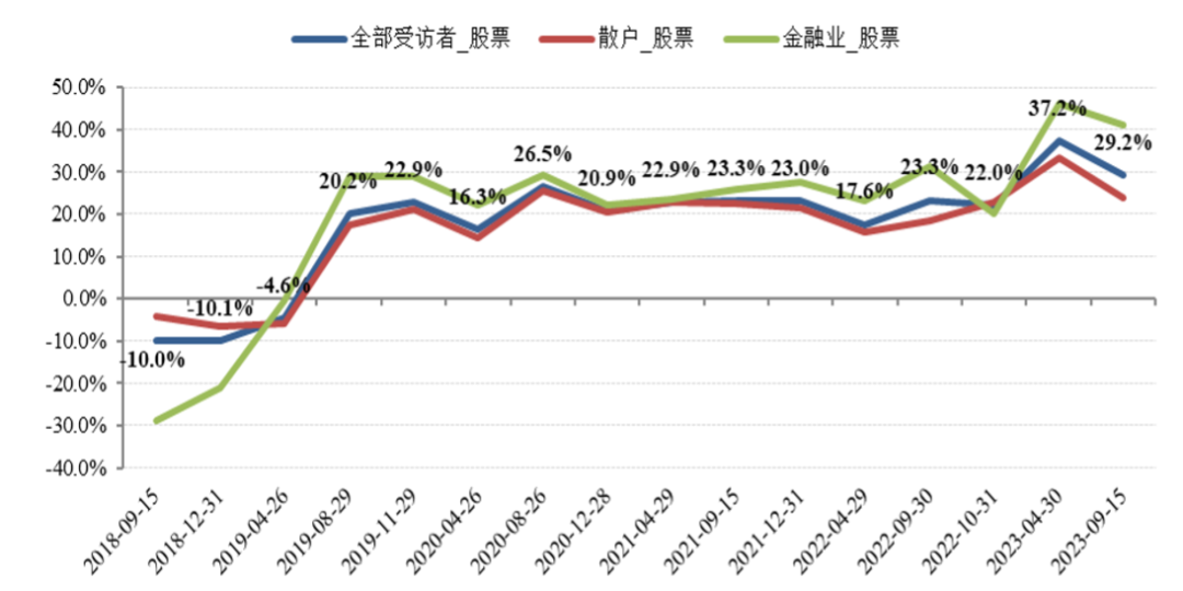 愿意投资股票、股票型基金的净增加人数占比为58.3%,其中散户和金融业分别为55.2%和65.3%,比上期下降5个百分点。