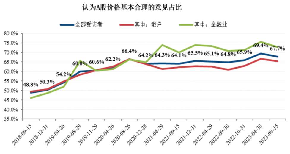 在本次调查中,约67.7%的投资者认为A股价格基本合理(散户和金融业分别为65.4%和72.8%),比上期下降1.7个百分点(散户和金融业分别下降1.3和2.7个百分点),比2022年10月末提高1.8个百分点(散户和金融分别提高2.4和1.5个百分点);