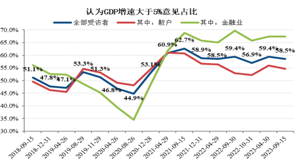 约58.5%的资者认为未来GDP增速能够超过5%(散户和金融业分别为54.6%和67.4%),比上期下降了0.9个百分点(散户下降了1.3个百分点,金融业提高了0.1个百分点);对GDP的预期增长率为5.3%(散户和金融业分别为5.1%和5.5%),与上期基本持平。