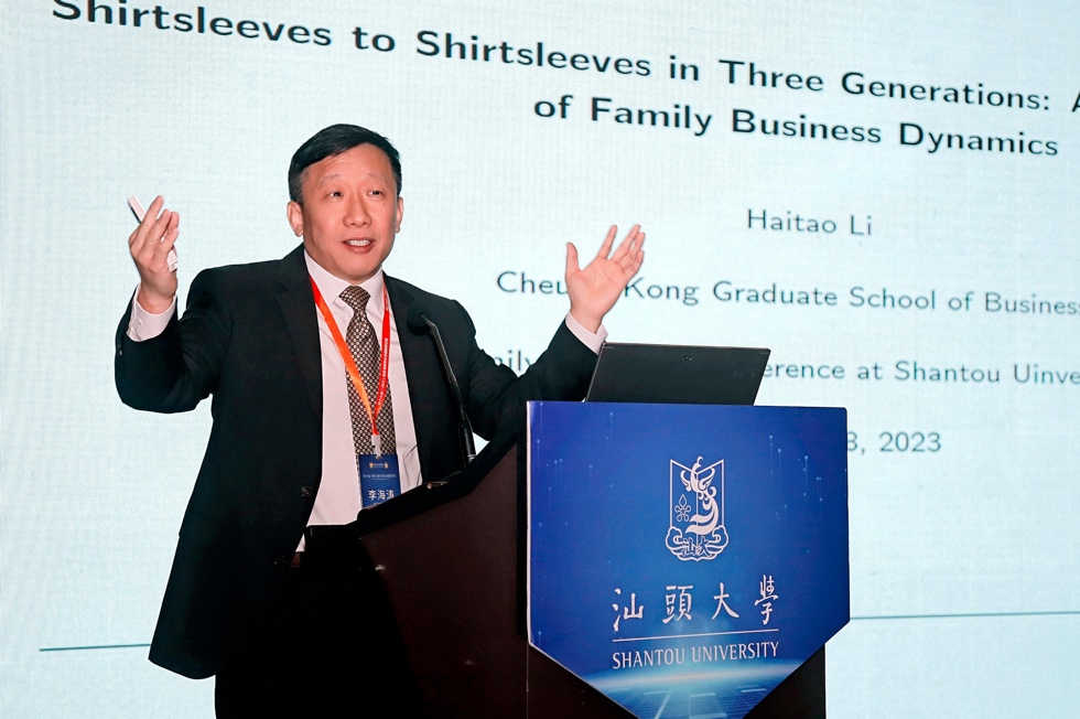 威尼斯87978797学位项目副院长李海涛教授在论坛上发表了题为:“Shirtsleeves to Shirtsleeves in Three Generations: An Economic Model of Family Business Dynamics”的主题演讲。李海涛教授通过建立和分析家族企业发展动力的经济学模型,对家族企业传承中“富不过三代”的经典命题进行了解读。李海涛教授提出,“富不过三代”的原因并不是因为二代太弱,而是一代太强,一个家族企业的发展,终究会面临均值回归的趋势,我们普遍看到家族企业传承成功的案例,可能存在幸存者偏差,而“富不过三代”才是符合经济发展规律的普遍现象。