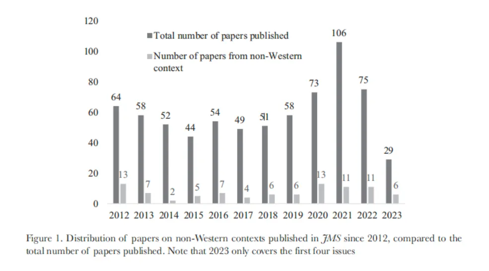 论文指出,尽管近年来顶级学术期刊编辑和学者呼吁更多关注非西方背景的研究,但实际的研究和发表仍然不足。论文以JMS为例,定量研究了该顶刊自2012年至2023年6月发表或被接受的所有论文,发现JMS发表的研究中仅有一小部分来自于非西方背景,另外刊载的非西方背景的研究更多依赖于定量数据而非定性数据,几乎没有非实证的研究刊出。