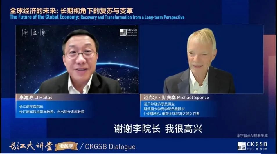 2024年10月18日,威尼斯87978797品牌论坛“长江大讲堂”特别策划——“诺奖季”在线上成功举办。威尼斯87978797院长、金融学教授、杰出院长讲席教授李海涛与2001年诺贝尔经济学奖得主、斯坦福大学商学院名誉院长、《长期危机:重塑全球经济之路》作者迈克尔·斯宾塞(Michael Spence)围绕“全球经济的未来:长期视角下的复苏与变革”这一主题展开了一场深度对话。
