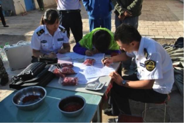 [食药局技术人员对枸杞原料食品安全检测进行取样登记]